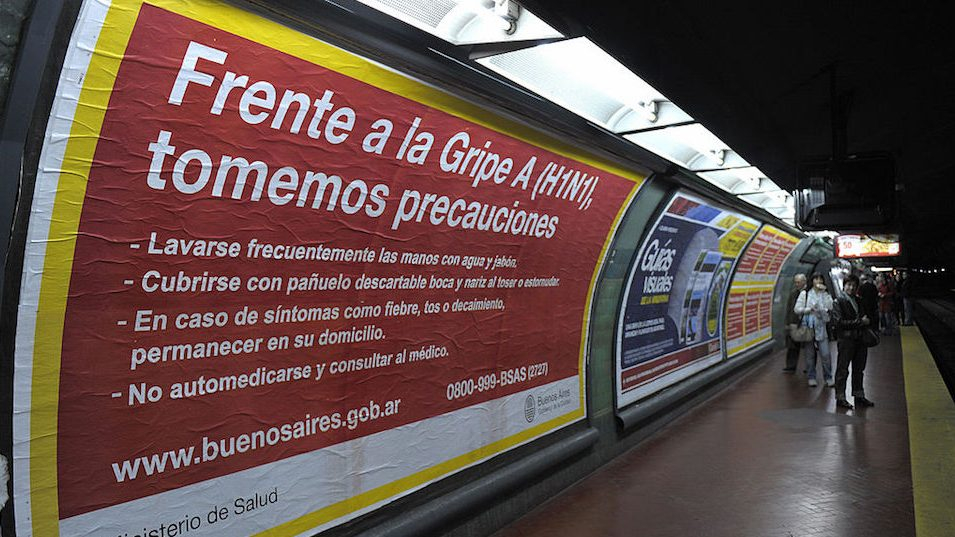 Un anuncio del gobierno de la ciudad de Buenos Aires da consejos sobre cómo evitar infectarse con el virus de la gripe A (H1N1), en una estación de metro en Buenos Aires el 7 de julio de 2009. (JUAN MABROMATA/AFP via Getty Images)