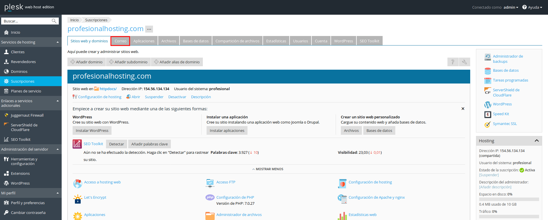 Una vez dentro, nos dirigiremos a Suscripciones >> accederemos a la suscripción de la cuenta de correo y luego a la ventana de Correo.