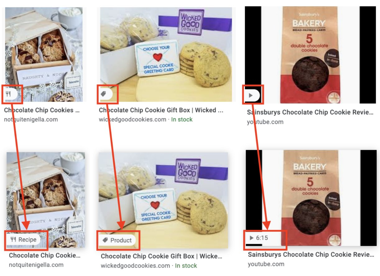 Later this week, Google Images will show new icons on desktop that provide useful information to indicate if images lead to pages with products for sale, recipes or video content. Mousing-over icons expands them to show the icons with text or length of video…. pic.twitter.com/RrbGnk27iq