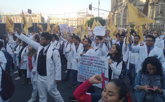 Vestidos de blanco y con flores en las manos, estudiantes de Medicina del Instituto Politécnico Nacional (IPN) y de la Universidad Nacional Autónoma de México (UNAM) protestan afuera de Palacio Nacional.