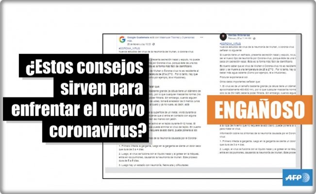 Bogotá, Colombia.- Una lista de supuestos consejos sobre cómo detectar y tratar el nuevo coronavirus circula ampliamente en redes sociales. AFP Factual entrevistó a especialistas y consultó las recomendaciones de diversas autoridades sanitarias, y la gran mayoría de estos consejos se basan en afirmaciones falsas o sin fundamento científico.