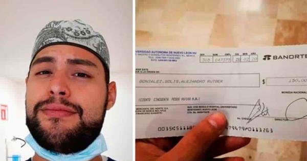 El estudiante que se identifica en su Facebook como Rutger Kobaza y quien trabaja en el Hospital Universitario de la Universidad Autónoma de Nuevo León, publicó una imagen del cheque que recibe por los servicios prestados en la unidad médica con valor de 150 pesos, pero además acompañó la foto con un mensaje controversial.